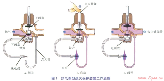 熱電偶熄火保護裝置的工作過程如圖l所示。當(dāng)燃具不工作時,下閥塞關(guān)閉主燃?xì)馔?span lang="EN-US">(如圖1a)。當(dāng)按下點火按鈕時,下閥塞打開,上閥塞關(guān)閉,燃?xì)馔ㄟ^點火管,燃具點火,同時鐵片與電磁鐵貼緊,點火火焰將熱電偶加熱,產(chǎn)生電動勢,使電磁鐵得磁而吸住鐵片(如圖lb)。此時放開按鈕,上下閥塞均打開,主燃?xì)馔方油ǎ季哒9ぷ?span lang="EN-US">(如圖1c)。當(dāng)火焰意外熄滅時,熱電偶冷卻,電動勢消失,電磁鐵失磁,鐵片脫落,下閥塞在彈簧作用下關(guān)閉氣路(如圖la)。