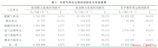 由表l可以看出,硫磺回收單元和尾氣處理單元效率最高,這是由于這2個單元主要為過程余熱回收單元,將過程反應(yīng)產(chǎn)生的余熱通過余熱鍋爐進行回收;而脫酸氣單元和脫水單元的效率較低是由于其再生過程為一個能低效的過程。從整個過程的損失分布來看,脫酸氣單元的損失最高,這是由于普光氣田天然氣凈化廠處理的原料氣中H2S含量很高,需要更大溶劑循環(huán)量才能使凈化氣達到商品氣標準,這導致再生過程的能耗大大增加,而溶液再生過程為典型的低效過程,因此造成了較高的損失。