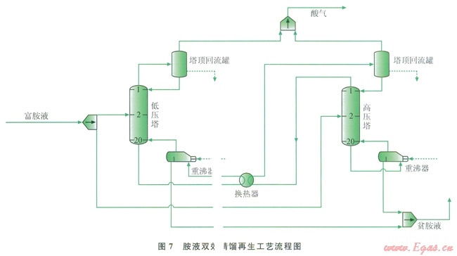 圖7為應(yīng)用ProMax軟件模擬醇胺溶液雙效精餾再生工藝流程。將胺液再生過程分為高、低壓2個再生塔,高、低壓塔分別得到等量從吸收塔中出來的醇胺溶液,各塔處理量為原再生塔的一半。在高壓塔頂增加冷凝器,并在低壓塔底配置再沸器,以避免低壓塔的塔底液體加熱量達不到分離要求所需的溫度,同時避免高壓塔頂?shù)臍怏w冷卻量達不到冷卻量要求。