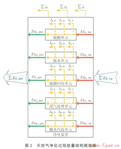 依據(jù)天然氣凈化過程能分析所確定的凈化過程3種炯損失,并借鑒“白箱”分析模型將各天然氣凈化操作單元視為一個“白箱”,每個“白箱”內(nèi)的損失為動量損失、傳熱損失和傳質(zhì)損失3部分,從而建立了如圖2所示的天然氣凈化過程能量結(jié)構(gòu)模型,圖2中∑Exsup和∑Exgain為外界供人凈化過程的能及產(chǎn)品凈化天然氣物流獲得的能;∑Exs,sup和∑Exs,gain為脫酸氣單位供人和獲得的能;∑ExD,sup和∑ExD,gain為脫水單位供人和獲得的能;∑ExR,sup和∑ExR,gain為硫磺回收單位供入和獲得的能;∑ExT,sup和∑ExT,gain為尾氣處理單位供人和獲得的能;∑ExW,sup和∑Exw,gain為酸水汽提單位供入和獲得的能;∑Ip、∑IH、∑IT,分別為凈化過程產(chǎn)生的動量損失、傳熱損失和傳質(zhì)損失;IS,P、IS,H、IS,T分別為脫酸氣單位產(chǎn)生的動量損失、傳熱損失和傳質(zhì)損失;ID,P、ID,H、ID,T分別為脫水單位產(chǎn)生的動量損失、傳熱損失和傳質(zhì)損失;IR,P、IR,H、IR,T分別為硫磺回收單位產(chǎn)生的動量損失、傳熱損失和傳質(zhì)損失;IT,P、IT,H、IT,T分別為尾氣處理單位產(chǎn)生的動量損失、傳熱損失和傳質(zhì)損失;IW,P、IW,H、IW,T分別為酸水汽提單位產(chǎn)生的動量損失、傳熱損失和傳質(zhì)損失。
