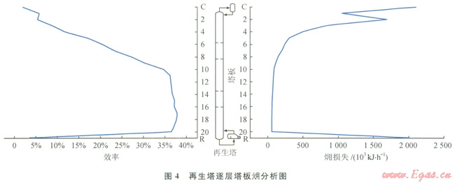 依據(jù)再生塔逐層塔板分析,在再生塔逐層塔板計算的基礎(chǔ)上,可以得到各層塔板上氣液相物流的物理能和擴散能,進而計算各層塔板的損失和熱力學效率。結(jié)合流程模擬軟件的模擬結(jié)果,應(yīng)用逐層塔板分析法,對胺液再生塔進行逐層塔板分析。圖4為損失分布圖,從圖4可知再生塔的損失主要發(fā)生在再生塔頂上部解吸擴散損失和塔頂冷凝器(C)、塔底重沸器中傳熱物理損失。