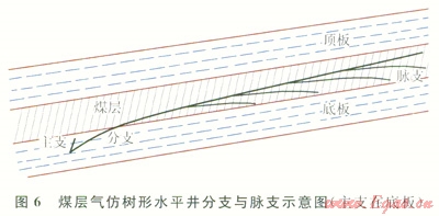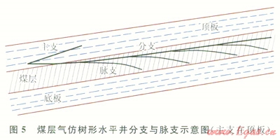 3)在每個分支上側(cè)鉆若干脈支(一般3~8個),脈支在煤層內(nèi),以溝通煤層內(nèi)裂隙為主要目的,不出煤層,長度一般50~400m,不求長,但數(shù)量盡可能多,以增大煤層氣解析面積(圖5)。