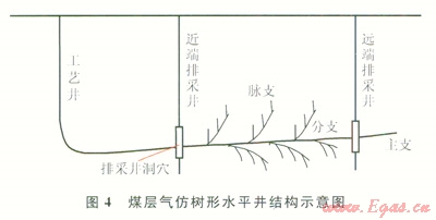 3)脈支是該系統(tǒng)產(chǎn)氣的主要來源,鉆穿煤層內(nèi)夾矸層,以溝通煤層內(nèi)裂隙為主要目的,不要求長度,但其數(shù)量盡可能多,以增大泄氣通道。