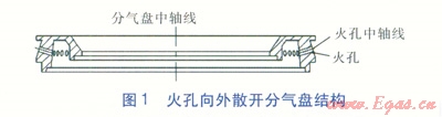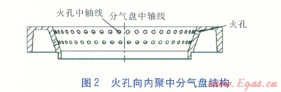 改變原來的火孔向外散開分氣盤結(jié)構(gòu),將分氣盤設(shè)計成火孔向內(nèi)聚中分氣盤,即火孔分布在分氣盤內(nèi)側(cè)邊緣。在火孔排布時,分氣盤應采用上下兩排火孔,兩排火孔的中軸線均與分氣盤的中軸線錯開,且火孔中軸線與水平面成一定角度,這樣的火孔稱為旋火火孔。旋火火孔產(chǎn)生的火焰圍繞分氣盤的中軸線呈盤繞狀,比直火火孔(火孔的中軸線與分氣盤的中軸線相交)更能產(chǎn)生渦流形成負壓,卷入更多的二次空氣,加速燃氣與二次空氣的再混合,并推動高溫煙氣螺旋上升,燃燒更聚中、充分,增強了高溫煙氣與鍋底的熱交換,減少了熱損失,從而提高了熱效率?;鹂紫蛲馍㈤_分氣盤結(jié)構(gòu)見圖1,火孔向內(nèi)聚中分氣盤結(jié)構(gòu)見圖2。
