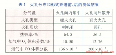 將傳統(tǒng)燃氣灶按照上述方法進行火孔分布和形式的改進,在鍋支架高度均為30mm、排煙間隙為30mm,未加裝半封閉燃燒室的情況下進行測試,改進前、后的測試結(jié)果見表1。在表1~4中,CO體積分數(shù)是指標準狀態(tài)下、過??諝庀禂?shù)為1時的折算值。