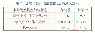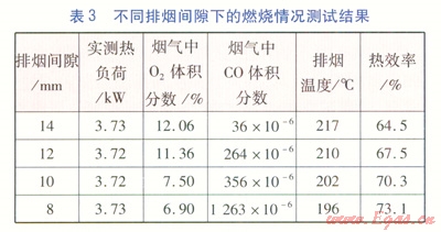 通過測試可知,排煙間隙小于10mm時,由于排煙阻力增大,不利于一次空氣與二次空氣的供給,造成燃燒不完全,CO排放超標。而排煙間隙為10mm時,熱效率可達70%以上,CO排放量也在標準要求的范圍之內(nèi)。因此排煙間隙為10mm最為理想。
