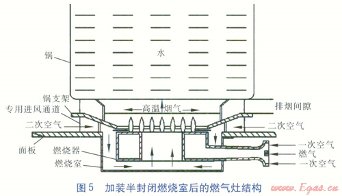 因此燃燒器應當放置在半封閉的燃燒室內(nèi),通過設(shè)計專用空氣通道供給燃燒所需空氣,實現(xiàn)空氣與煙氣分離,使燃燒系統(tǒng)達到一個穩(wěn)定的燃燒狀態(tài),減少煙氣帶走的熱量損失,從而提高燃氣灶的熱效率。