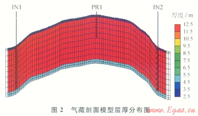 該氣藏儲(chǔ)層為河流相沉積,以砂巖為主,地層溫度35℃,平均地層壓力10MPa。氣藏主要含氣集中在埋深約為1000m之處。氣藏上下部均有滲透率孔隙度極低的致密蓋層,氣密性適宜作為CO2埋存靶場(chǎng)。氣藏剖面模型為一背斜構(gòu)造模型(圖2)。X方向?yàn)?span lang="EN-US">3000m,劃分為120個(gè)網(wǎng)格;2方向分為115m,劃分為12層,其中最上兩層為致密蓋層,最下兩層為致密隔層,中間的氣層分為8個(gè)小層。該氣藏為反韻律儲(chǔ)層。儲(chǔ)層束縛水飽和度為30%,注采井組設(shè)計(jì)是在提取的反韻律模型中,兩端低部位分別設(shè)計(jì)1口CO2注氣井,注氣井均只打開(kāi)產(chǎn)層的下1/4井段;在地層剖面模型的中間高點(diǎn)上設(shè)計(jì)l口采氣井,只打開(kāi)氣層的上1/4井段采氣。