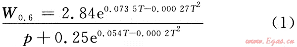 式中:W0.6為氣體相對密度為0.6時與純水平衡時的水蒸氣含量,g/cm3;CC為水中含鹽量的校正系數(shù);Cp為W0.6的校正系數(shù),與溫度有關(guān);KC為水的含鹽量,kg/m3;T為溫度,℃;rg為氣體相對密度。