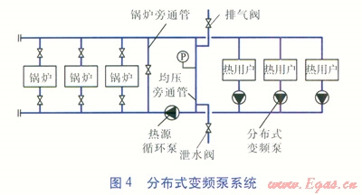 隨著我國供熱行業(yè)節(jié)能意識的不斷增強,分布式變頻泵系統(tǒng)在供熱領(lǐng)域的應(yīng)用越來越廣泛。分布式變頻泵系統(tǒng)的熱源循環(huán)泵只需要克服熱源內(nèi)部阻力,大大減小了熱源循環(huán)泵的能耗。分布式變頻泵承擔熱用戶(熱力站)的流量,克服熱用戶及管網(wǎng)阻力。與傳統(tǒng)動力集中式系統(tǒng)相比,降低了近端熱用戶節(jié)流富裕壓頭造成的能量損失。因此,理論上分布式變頻泵系統(tǒng)沒有多余的能耗,比傳統(tǒng)動力集中式系統(tǒng)節(jié)能。分布式變頻泵系統(tǒng)見圖4。