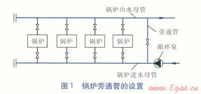 在熱水鍋爐房系統(tǒng)中,在鍋爐的進出水母管之間一般設(shè)置一條旁通管道(見圖l)。鍋爐旁通管有以下兩種作用,分別計算確定鍋爐旁通管管徑后,選取較大的管徑。