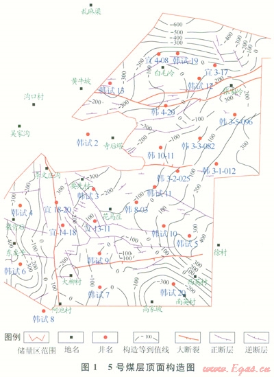 韓試20井位于構(gòu)造低幅度區(qū)(圖1),該井5號(hào)煤層頂?shù)装鍨楹駥幽鄮r,含水性較差,即使人工壓裂施工中將頂?shù)装鍓捍膊粫?huì)增加出水量;且該井遠(yuǎn)離斷裂帶,表明斷裂對(duì)出水的影響不大。該井11號(hào)煤層的老頂為石灰?guī)r,該套石灰?guī)r可能成為一套富水性較好的巖溶含水層,盡管ll號(hào)煤層的直接頂板較厚,難以壓穿并溝通該套石灰?guī)r巖溶含水層。然而,處于高構(gòu)造部位的鄰井,如泥巖直接頂較薄,或該套石灰?guī)r巖溶含水層為直接頂,高部位的水將會(huì)沿著煤層割理流向構(gòu)造低部位的韓試20井。該井5號(hào)、ll號(hào)煤層壓裂排采初期日產(chǎn)水40m3,表明出水的主要原因在于該井位于構(gòu)造低幅度區(qū),高部位含水層中的地層水沿著煤巖割理流向低構(gòu)造幅度去的韓試20井,致使排采出水量增大。