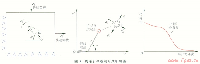 在水力壓裂過(guò)程中快速降低排量、甚至停泵,或瞬時(shí)卸載放噴,都可形成近乎垂直于徑向裂縫的周緣引張裂縫。這些壓裂方式可造成井筒內(nèi)快速卸壓,流體帶動(dòng)煤巖體向井筒方向徑向位移,位移量白鉆孔壁面向外逐漸減小。由于煤巖體中結(jié)構(gòu)弱面兩側(cè)位移量不同,將產(chǎn)生拉應(yīng)力,當(dāng)拉應(yīng)力超過(guò)巖體抗拉強(qiáng)度時(shí),裂縫開始萌生擴(kuò)展,形成周緣引張裂縫[20-21](圖3)。