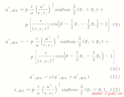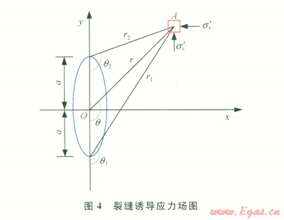 式中s¢x誘導(dǎo)為x方向誘導(dǎo)有效應(yīng)力;s¢y誘導(dǎo)為y方向誘導(dǎo)有效應(yīng)力;p為縫內(nèi)流體壓力;r為A點(diǎn)到坐標(biāo)原點(diǎn)的距離;r1、r2分別為A點(diǎn)到裂縫兩個(gè)端點(diǎn)的距離;q1、q2分別為A點(diǎn)和裂縫兩個(gè)端點(diǎn)連線與y軸的夾角;v為泊松比。