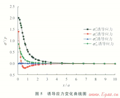 以誘導(dǎo)應(yīng)力與裂縫中的凈壓力p的比值為縱坐標(biāo),以與初始裂縫的距離x和半縫高a的比值為縱軸作圖(圖5),由圖5可以看出誘導(dǎo)應(yīng)力的大小隨著與初始裂縫距離的變化而改變,在3倍的半縫高距離以后,誘導(dǎo)應(yīng)力變的得很小,可以忽略不計(jì)[25]。