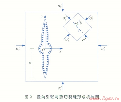 當(dāng)KI>KIC(KIC為煤巖體的張性裂縫斷裂韌度)時(shí),裂縫開始向前擴(kuò)展,且沿著最大主應(yīng)力方向延伸、最小主應(yīng)力方向張開,任何壓裂方式均可形成此類裂縫(圖2)。