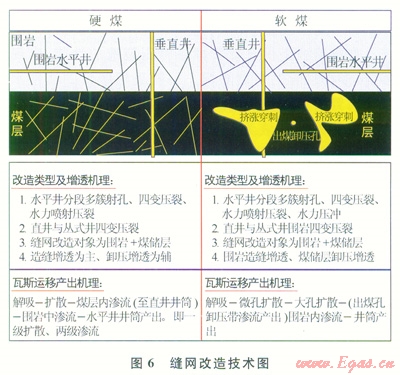 圍巖抽采層—煤儲(chǔ)層縫網(wǎng)改造技術(shù)適合于地面煤層氣開發(fā)和井下瓦斯抽采,是一種相對(duì)普適性技術(shù)。其核心是根據(jù)煤巖體結(jié)構(gòu)和力學(xué)性質(zhì),針對(duì)不同的井型采用不同的水力壓裂工藝,最大限度地形成多級(jí)、多類裂縫體系,達(dá)到快速抽采瓦斯的目的。對(duì)于硬煤儲(chǔ)層強(qiáng)化的是圍巖和煤儲(chǔ)層,瓦斯以一級(jí)擴(kuò)散、兩級(jí)滲流方式產(chǎn)出;對(duì)于軟煤儲(chǔ)層強(qiáng)化的是圍巖,煤層不能被強(qiáng)化,只能形成擠脹和穿刺,瓦斯以兩級(jí)擴(kuò)散、一級(jí)滲流方式產(chǎn)出[12](圖6)。但軟煤可以通過(guò)水力壓沖出煤卸壓實(shí)現(xiàn),其機(jī)理另文探討。圍巖煤儲(chǔ)層縫網(wǎng)改造可通過(guò)下述技術(shù)途徑實(shí)現(xiàn)。