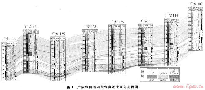 如廣安氣田須四段氣藏,在近北西向的氣藏剖面上(圖1),可以看出存在多個氣水系統(tǒng),屬于構造背景下的巖性氣藏。每個含氣層的測試地層壓力都不相同,壓力系數(shù)主要為1.1~1.4,基本上都是一個獨立小氣藏,具有獨立的壓力系統(tǒng)。由于分割層的發(fā)育和儲層的低孔低滲,造成氣水水分異差,儲層含水飽和度高,測試上基本屬于氣水同出的層段,純氣層薄而少。