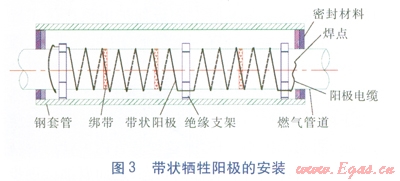 ②不可避免使用套管時,可在套管內(nèi)部采取局部的陰極保護也是一種很有效的辦法。具體做法是:在套管內(nèi)的主管道上纏繞鎂陽極帶或鋅陽極帶或安裝鐲式陽極[4]。當主管道外防腐層為3PE防腐時,推薦使用纏繞鎂陽極帶的局部陰極保護。安裝鎂陽極帶時,可采用機械打磨的方法,露出里面的鋼管約3~5cm癌主管道上開鑿一個合適的焊點,采用電焊、鋁熱焊等焊接方式把鎂陽極帶一端焊接到主管道上,根據(jù)不同的管徑按照一定的角度和間距,貼著管道的外壁緊緊纏繞。針對不同管徑,鎂陽極帶有不同的纏繞角度:當燃氣管道外徑≤219mm時,鎂陽極帶沿管道外壁等距且與管道軸向成30°角纏繞;當燃氣管道外徑為219~377mm時,沿管道外壁等距且與管道軸向成45°角纏繞;當燃氣管道外徑≥377mm時,沿管道外壁等距且與管道軸向成600角纏繞[4]。鎂陽極帶另一端也要和起點一樣,焊接在主管道上,而且兩個焊點都要做好絕緣防腐。鎂陽極帶纏繞施工完畢,套管兩端應(yīng)采用柔性的防腐、防水材料密封,并保證密封良好,防止水或其他雜物的進入。纏繞鎂陽極帶法的優(yōu)點是施工簡單方便,缺點是鎂的電位較負,保護年限不是很長[4]。帶狀犧牲陽極的安裝見圖3。