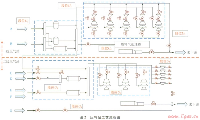 某壓氣站包括一線工程和二線工程。其中,一線有2路來氣,設計輸量為120×108m3/a(在0℃,l個標準大氣壓下的氣體體積)。二線有5路來氣,設計輸量為l20×108m3/a。各路來氣壓力約為4MPa,一線經過壓縮機組加壓后壓力約為6.4MPa,二線經加壓后壓力上升為9.6MPa。根據(jù)壓氣站的工藝關斷閥和ESD閥的設置情況,將該站場分為8個工藝段位,分別見壓氣站工藝流程圖2和表l所示。