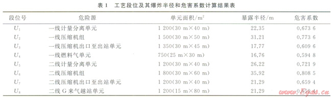工藝段位(Section)的劃分,除了可以根據(jù)圖2中的各關斷位置之外,還可以根據(jù)工藝單元或者參考HAZOP報告的節(jié)點來劃分。本例的主要危害后果是天然氣泄漏之后的潛在火災爆炸,因此根據(jù)道化F&E指數(shù)計算流程分別對各工藝段位進行計算,結果如表1所示。