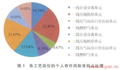 根據(jù)表1的數(shù)據(jù),由式(2)計算相對危險系數(shù)RH∽并按照圖1的流程進行第一層的風險準則額度分解,得到各工藝段位的RTCU值,如表2所示。各段位的風險額度比例如圖3所示。從中可見,一線和二線的壓縮機組單元的RTCU值占比最大,兩者合計接近44%。表明壓縮機單元的風險較大,因此所分配的個人風險容許準則也相對較大。這與從風險經濟學的角度看也是合理的,有利于從全局的角度優(yōu)化風險處置的成本。