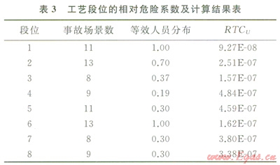 得到各工藝段位的風險準則額度后,按照圖1所示的第二階段計算流程,就可以得到某一工藝段位的各事故場景RTCS。為此需要統(tǒng)計該站場內的人員分布情況,具體包括站長、自控工程師、設備工程師、通訊工程師、電氣工程師、運行人員、保管和門衛(wèi)等8類人員。這里各類人員都是當作假想人員來加權考慮的,以避免某一類別的人員數(shù)增加而導致風險評估中的Salami切片現(xiàn)象[3]??尚诺氖鹿蕡鼍皵?shù)根據(jù)該站場的HAZOP分析報告確定,此外本例中為簡化起見,令參數(shù)UFU=1。根據(jù)式(4)和式(5)計算得到最終所需要的事故場景定量風險容許準則值RTCU,如表3所示。