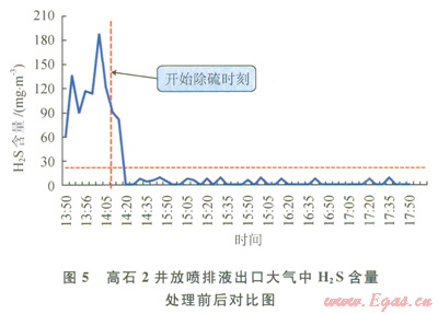 含硫井排出液自動實時處理流程(圖4)和]二藝技術(shù)目前已經(jīng)在川渝地區(qū)多口井開展應(yīng)用,效果顯著(圖5),如高石2井在排液期間,采用該技術(shù)對井筒產(chǎn)出液進行處理前,放噴出口大氣環(huán)境中H2S含量主要維持在115~173mg/m3范圍內(nèi),而應(yīng)用該技術(shù)后,放噴出口大氣環(huán)境中H2S含量降低到8.65mg/m3以內(nèi),可以滿足井場人員連續(xù)作業(yè)的要求。