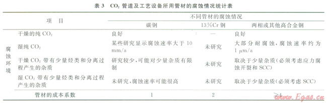 CO2管道及工藝設(shè)備所用管材的腐蝕情況統(tǒng)計(jì)結(jié)果見表3[6]。