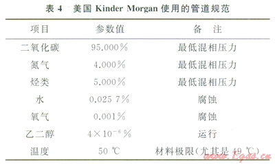 日前運(yùn)行的管道中所輸送的CO2混合物及對(duì)純度和含水量的規(guī)定等都不盡相同。國(guó)際上對(duì)于管道系統(tǒng)輸送CO2混合氣體的組成要求沒有統(tǒng)一的標(biāo)準(zhǔn)?;旌蠚怏w的組成要求很大程度上取決于設(shè)計(jì)階段進(jìn)行的評(píng)估,包括流動(dòng)安全、管道完整性、安全性及終端用戶對(duì)CO2純度的需求。美國(guó)Kinder Morgan使用的管道規(guī)范見表4[12]。