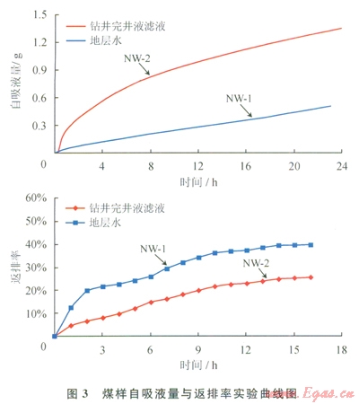 煤巖具有高毛細(xì)管壓力特征,鉆井完井液濾液與煤層接觸后在毛細(xì)管力的作用下將發(fā)生毛細(xì)管自吸,使煤層含水飽和度增加,氣相滲透率降低,并導(dǎo)致后期排采作業(yè)中鉆井完井液濾液長(zhǎng)時(shí)間難以完全返排。為了掌握煤巖對(duì)鉆井完井液濾液的毛細(xì)管自吸特征,開(kāi)展了相同滲透率級(jí)別煤樣的地層水和鉆井完井液濾液毛細(xì)管自吸實(shí)驗(yàn)和模擬排采過(guò)程的氣驅(qū)水返排實(shí)驗(yàn)[14]。實(shí)驗(yàn)結(jié)果(圖3)表明,自吸曲線初始階段白吸速率很快,液相在毛細(xì)管力作用下迅速自吸進(jìn)入裂隙和大孔中,隨著時(shí)間的增長(zhǎng)白吸速率逐漸下降,液相以擴(kuò)散吸附的方式進(jìn)入微孔,相同時(shí)間內(nèi)鉆井完井液濾液的白吸量高于地層水的自吸量。通過(guò)氣相返排實(shí)驗(yàn)結(jié)果(圖3和表l)可以看出滲透率級(jí)別相近條件下地層水的返排率明顯高于鉆井完井液濾液的返排率,表明鉆井完井液濾液的吸附滯留將嚴(yán)重影響煤樣的返排能力,導(dǎo)致氣相滲透率的顯著降低。