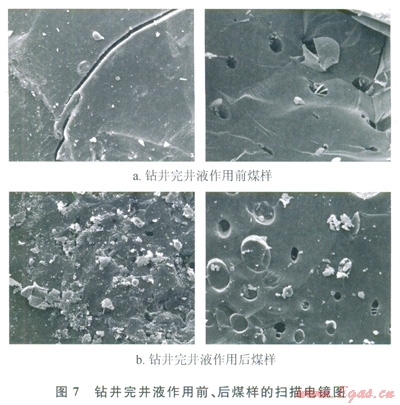 煤巖儲(chǔ)層鉆井過(guò)程中在正壓差作用下,鉆井完井液濾液將侵入煤層,當(dāng)鉆井完井液濾液與煤層流體小配伍時(shí),在煤層溫度、壓力、pH值等條件的作用下極易產(chǎn)生沉淀物。鉆井完井液固相和產(chǎn)生的沉淀物將堵塞煤層裂縫和孔隙,導(dǎo)致煤巖儲(chǔ)層滲透性降低。圖7為鉆井完井液作用前后煤樣掃描電鏡結(jié)果,可見(jiàn)鉆井完井液未作用煤樣孔隙和裂縫未被充填,具有較好的連通能力,而鉆井完井液作用后煤樣裂縫和孔隙均被不同程度充填,尤以裂縫充填最為嚴(yán)重,大大降低了原有的連通能力,使?jié)B透率顯著下降。