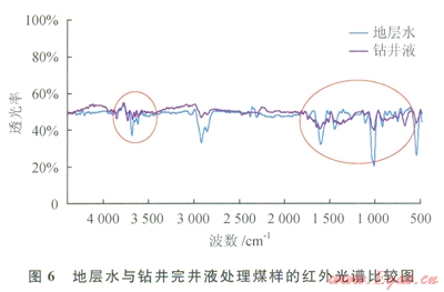 為了研究鉆井完井液作用對(duì)煤的結(jié)構(gòu)特征的影響,筆者對(duì)比了地層水與鉆井完井液浸泡樣品的紅外光譜,發(fā)現(xiàn)在3700~3500cm-1、1900~1300cm-1和1300~650cm-1這3個(gè)波數(shù)區(qū)存在較大差異(圖6)。