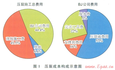 眾所周知,非常規(guī)油氣開發(fā)的經(jīng)濟(jì)效益取決于成本的控制,北美取得頁(yè)巖氣開發(fā)的成功正是由于采用了低成本的清水壓裂[4]。但以勝利油田某非常規(guī)頁(yè)巖油氣井的壓裂開采預(yù)算為例(圖1),不難看出,國(guó)外公司的完井工具、壓裂材料(壓裂液和支撐劑)以及技術(shù)服務(wù)費(fèi)用占據(jù)全部壓裂費(fèi)用的44.4%,其中,壓裂液的費(fèi)用又占BJ公司全部預(yù)算的57%。兇此,目前的非常規(guī)油氣開發(fā)模式難以取得經(jīng)濟(jì)效益,從長(zhǎng)遠(yuǎn)角度出發(fā),必須要有大量的資金和科研力量投入到非常規(guī)油氣開采的基礎(chǔ)研究上,從完井工具、壓裂液和支撐劑以及相關(guān)技術(shù)上打破國(guó)外技術(shù)壟斷。提升壓裂開采的軟件實(shí)力,才能有效控制開發(fā)成本,取得并提高經(jīng)濟(jì)效益。