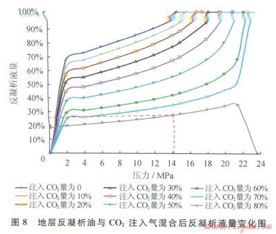 將做完等組成膨脹實驗后的流體樣品加壓充分攪拌后,靜止2~3h。然后將地層流體在地層溫度(130℃)定容衰竭到目前地層壓力14.12MPa,并將最后一級的氣體全部排出,對剩余的凝析油做注CO2膨脹實驗。這是針對注入CO2氣體與凝析油之間增溶過程相態(tài)配伍性的研究。圖6為衰竭開發(fā)到l4.12MPa下反凝析油飽和壓力隨CO2注氣量變化的p-T相圖,隨CO2注氣量增加凝析油飽和壓力逐漸增加,但增加的幅度不大,在CO2注入物質的摩爾量濃度為50%時,凝析油的飽和壓力為20.03MPa,目CO2與地層反凝析油達到一次接觸混相壓力需達23.54MPa。反凝析油隨CO2注氣量變化的p-T相圖和注入不同比例CO2反凝析液量隨壓力變化曲線見圖7、8。圖7表明,在地層溫度下,隨著CO2注氣量增加,反凝析油體系的飽和壓力增加,臨界點從右向左偏移,臨界溫度降低,臨界壓力增加,注CO2后混合物體系相圖向輕質化特征轉變(向左收縮變窄)。