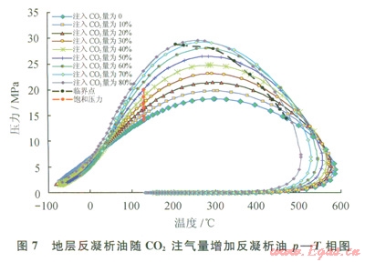 5)當CO2注入氣摩爾含量在70%~80%時,反凝析液量曲線出現(xiàn)突變;隨著壓力下降,反凝析液量變化趨勢由逐漸減小轉為先增加后減小的趨勢,表明反凝析油逐漸從輕質凝析油體系轉變?yōu)閱蜗嗄鰵怏w系。