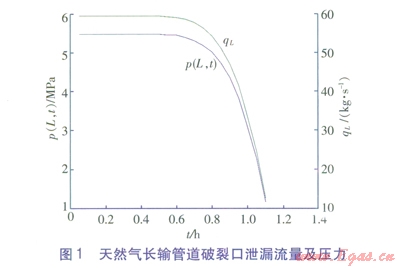 ②由于管道中天然氣的高壓,在泄漏的前一段時間,破裂口前壓力和泄漏質(zhì)量流量改變都很小。經(jīng)歷一段時間后,兩者都急劇下降。