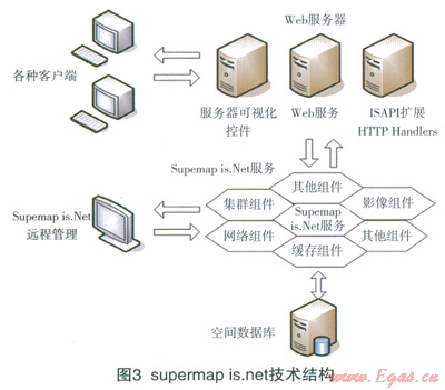 G1S的數(shù)據(jù)庫(kù)是以圖形為基礎(chǔ),根據(jù)不同的要求有不同的數(shù)據(jù)結(jié)構(gòu)[10]。本文采用supermap組建來(lái)實(shí)現(xiàn)燃?xì)夤艿里L(fēng)險(xiǎn)水平的可視化。supermap是一個(gè)標(biāo)準(zhǔn)的控件GIS產(chǎn)品,可以在多種語(yǔ)言上使用。Supermap中deskpro是一套運(yùn)行在桌面端的專業(yè)GIS軟件,提供了地圖編輯、屬性數(shù)據(jù)管理、分析與決策輔助事務(wù)處理、地圖輸出、報(bào)表打印、三維建模等方面的功能。supermap is.net是新一代網(wǎng)絡(luò)地理信息系統(tǒng)開發(fā)平臺(tái),supemlap is.net由客戶端用戶界面表現(xiàn)組件、web服務(wù)器擴(kuò)展、GIS服務(wù)器、數(shù)據(jù)服務(wù)器以及遠(yuǎn)程管理器等多個(gè)組件組成,如圖3所示[11-13]。