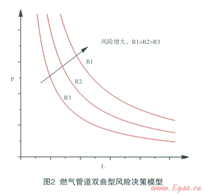 對(duì)于燃?xì)夤艿朗鹿实娘L(fēng)險(xiǎn)評(píng)價(jià)方法有多種,主要有定性風(fēng)險(xiǎn)評(píng)價(jià)法、半定量風(fēng)險(xiǎn)評(píng)價(jià)法和定量風(fēng)險(xiǎn)評(píng)價(jià)法。定量風(fēng)險(xiǎn)評(píng)價(jià)方法是在將與風(fēng)險(xiǎn)相關(guān)的參數(shù)進(jìn)行量化的基礎(chǔ)上進(jìn)行的風(fēng)險(xiǎn)評(píng)價(jià),能夠?qū)ξkU(xiǎn)源或系統(tǒng)的風(fēng)險(xiǎn)程度進(jìn)行定量描述,與定性風(fēng)險(xiǎn)評(píng)價(jià)相比,能夠?qū)崿F(xiàn)多層次描述危險(xiǎn)源或系統(tǒng)的風(fēng)險(xiǎn)程度,以支持安全管理決策[4]。雙曲型風(fēng)險(xiǎn)決策模型就是定量風(fēng)險(xiǎn)評(píng)價(jià)方法中的一種。