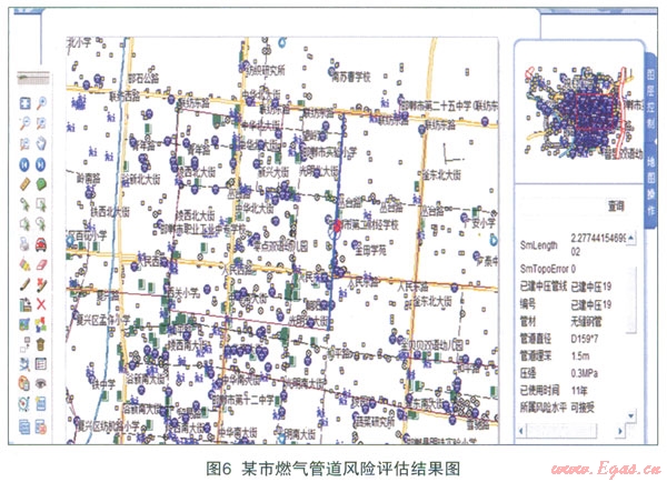 (4)實(shí)現(xiàn)燃?xì)夤艿里L(fēng)險(xiǎn)水平的可視化。首先得到該市的燃?xì)夤艿赖臇鸥駡D像,經(jīng)轉(zhuǎn)換成矢量數(shù)據(jù)并作適當(dāng)處理后存入supermap deskpro。將燃?xì)夤艿赖幕拘畔⒓帮L(fēng)險(xiǎn)水平等相關(guān)數(shù)據(jù)導(dǎo)入supermap deskpro,再使用supermap is.net將相關(guān)數(shù)據(jù)顯示出來(lái),可以使用查詢條件查詢?nèi)細(xì)夤艿赖幕拘畔⒓捌滹L(fēng)險(xiǎn)水平,這樣可以通過圖得知各段管道的風(fēng)險(xiǎn)情況并及時(shí)采取相應(yīng)的措施。查詢結(jié)果如圖6所示。