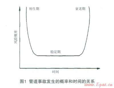按照W.KentMuhlbauer的分類方法,造成管道失效和事故的原因共4大類:①第三方破壞。第三方破壞原因是指燃?xì)夤艿酪蜃钚÷裆?、地面上的活?dòng)狀況(水平)、當(dāng)?shù)鼐用竦乃刭|(zhì)(公眾教育)、管道地上設(shè)備安全、線路狀況、巡線頻率等因素,這些因素以外力擠壓或人為破壞的形式使燃?xì)夤艿朗艿綋p壞。②管道腐蝕。腐蝕是導(dǎo)致燃?xì)夤艿?span lang="EN-US">(主要是鋼管)穿孔、破裂的重要破壞因素。對(duì)于埋地管道而言,腐蝕來(lái)自兩個(gè)方面:內(nèi)腐蝕和外腐蝕。③人工誤操作。人工誤操作包括設(shè)計(jì)誤操作、施工誤操作、技術(shù)誤操作、管理與監(jiān)督誤操作、運(yùn)行維護(hù)與檢測(cè)誤操作等,這些誤操作會(huì)導(dǎo)致燃?xì)夤芫W(wǎng)運(yùn)行的安全性降低,風(fēng)險(xiǎn)增加。④管網(wǎng)設(shè)計(jì)。設(shè)計(jì)需考慮的因素有管道最大承受壓力、管內(nèi)水擊因素、設(shè)計(jì)厚度和選材選型、士層移動(dòng)、線路選擇、施工方案等,考慮不周會(huì)導(dǎo)致燃?xì)馐鹿实陌l(fā)生。在實(shí)際風(fēng)險(xiǎn)管理中,用普通的概率計(jì)算方法計(jì)算其風(fēng)險(xiǎn)概率相當(dāng)困難,有些還不可能實(shí)現(xiàn)。因此,采用美國(guó)核管理委員會(huì)(NUREG)推薦的方法,通過計(jì)算失效速率得出風(fēng)險(xiǎn)概率。由分析統(tǒng)計(jì)的相關(guān)資料可知,管道發(fā)生事故的風(fēng)險(xiǎn)概率一般符合U型曲線(見圖l),即初期處于磨合階段,管道工作并不穩(wěn)定,后期接近設(shè)計(jì)壽命,事故發(fā)生也較頻繁。若只考慮中間的穩(wěn)定期,則其風(fēng)險(xiǎn)速率v可視為常數(shù)。