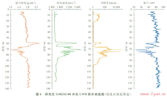 6)GMGS2-04井。水深913m,137~143mbsf層段測井資料顯示電阻率為4W·m,推測可能為分散狀水合物。
