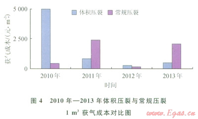 分析可知2010年—2013年體積壓裂每立方米獲氣成本呈下降趨勢(圖4),獲氣成本從2010年的4987元/m3下降到155元/m3,鉆井新工藝配套技術(shù)的完善與應(yīng)用,是體積壓裂獲氣成本下降的主要因素;常規(guī)壓裂獲氣成本隨機(jī)變化,主要決定因素在于油氣儲(chǔ)層本身的性能(儲(chǔ)量)。以上統(tǒng)計(jì)資料表明2010年—2013年體積壓裂總投資為179231萬元,總測試產(chǎn)量為497.63×104m3/d,平均獲氣成本為360.17元/m3;常規(guī)壓裂總投資為88392萬元,總測試產(chǎn)量為234.86×104m3/d,平均獲氣成本為376.36元/m3。