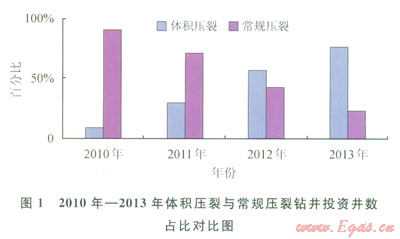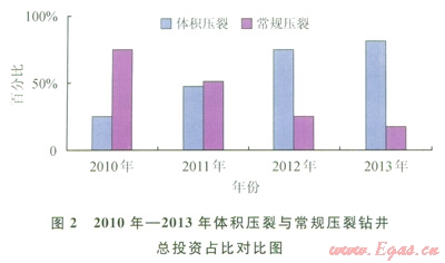 2010年—2013年蜀南氣礦在川南地區(qū)加砂壓裂鉆井累計(jì)投資267623萬元:其中體積壓裂179231萬元、占比66.97%,常規(guī)壓裂88392萬元、占比33.03%。在此期間,2010年加砂壓裂投資21311萬元:其中體積壓裂5386萬元,占比25.25%,常規(guī)壓裂15925萬元,占比74.75%;2011年加砂壓裂投資59344萬元:其中體積壓裂28608萬元,占比48.21%,常規(guī)壓裂30736萬元,占比51.79%;2012年投資107910萬元:其中體積壓裂80645萬元,占比74.73%,常規(guī)壓裂27265萬元,占比25.27%;2013年投資79058萬元:其中體積壓裂64592,占比81.7%,常規(guī)壓裂14466萬元,占比18.3%,體積壓裂投資占比呈逐漸上升趨勢(圖2)。