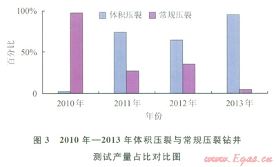 2010年—2013年蜀南氣礦在川南地區(qū)加砂壓裂鉆井累計(jì)測試產(chǎn)量732.49×104m3/d:其中體積壓裂獲取測試產(chǎn)量497.63×104m3/d,占比67.94%,常規(guī)壓裂獲取測試產(chǎn)量234.86×104m3/d,占比32.06%。在此期間,2010年測試產(chǎn)量39.82×104m3/d:其中體積壓裂1.08×104m3/d,占比2.79%,常規(guī)壓裂38.74×104m3/d,占比97.21%;2011年測試產(chǎn)量48.24×104m3/d:其中體積壓裂35.41×104m3/d,占比73.4%,常規(guī)壓裂12.83×104m3/d,占比26.6%;2012年測試產(chǎn)量498.89×104m3/d:其中體積壓裂322.52×104m3/d,占比64.65%,常規(guī)壓裂176.37×104m3/d,占比35.35%;2013年測試產(chǎn)量145.54×104m3/d:其中體積壓裂138.62×104m3/d,占比95.25%,常規(guī)壓裂6.92×104m3/d,占比4.75%,體積壓裂測試產(chǎn)量占比呈上升趨勢(圖3)。