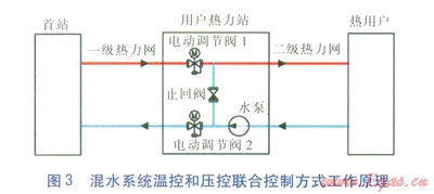 隨著能源和環(huán)境問題日益突出,節(jié)能和環(huán)保引起全球關(guān)注,成為人類社會生存和發(fā)展的兩大主題。混水系統(tǒng)作為一種更加節(jié)能的供熱方案,得到了日益廣泛的應(yīng)用?;焖到y(tǒng)工作原理見圖1,將一級管網(wǎng)的高溫水和二級管網(wǎng)的低溫水在用戶熱力站不經(jīng)過換熱器按比例直接混合后供給熱用戶。