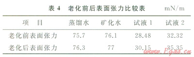 由表4數(shù)據(jù)分析可知,老化前后試液的表面張力變化不大,說明泡排劑的熱穩(wěn)定性比較好。