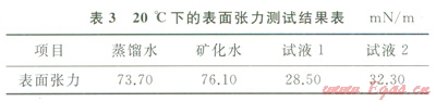 參考標準SY/T5370—1999配制礦化水(稱取10g氯化鈣和40g氯化鈉,用蒸餾水于燒杯中溶解,并用蒸餾水沖洗3次,沖洗液全部轉(zhuǎn)入該容量瓶中,加蒸餾水至總體積1000mL,得到礦化度50g/L的礦化水)、試液1(0.3%蒸餾水泡排劑溶液)、試液2(0.3%礦化水泡排劑溶液)。分別測定蒸餾水、礦化水、試液1、試液2的表面張力(表3)。