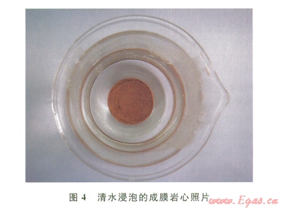 將原始巖心與成膜后的巖心分別放入清水中浸泡24h,原始巖心由于水化分散明顯(圖3),有防水滲膜后的巖心由于有致密的防水滲膜保護(hù),未出現(xiàn)水化分散現(xiàn)象(圖4),說(shuō)明所形成的防水滲隔膜不能被清水溶解。