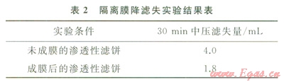 用水基鉆井液壓制成滲透性濾餅進(jìn)行清水滲透性實(shí)驗(yàn),評(píng)價(jià)防水滲膜防自由水滲透的效果。實(shí)驗(yàn)結(jié)果見(jiàn)表2。